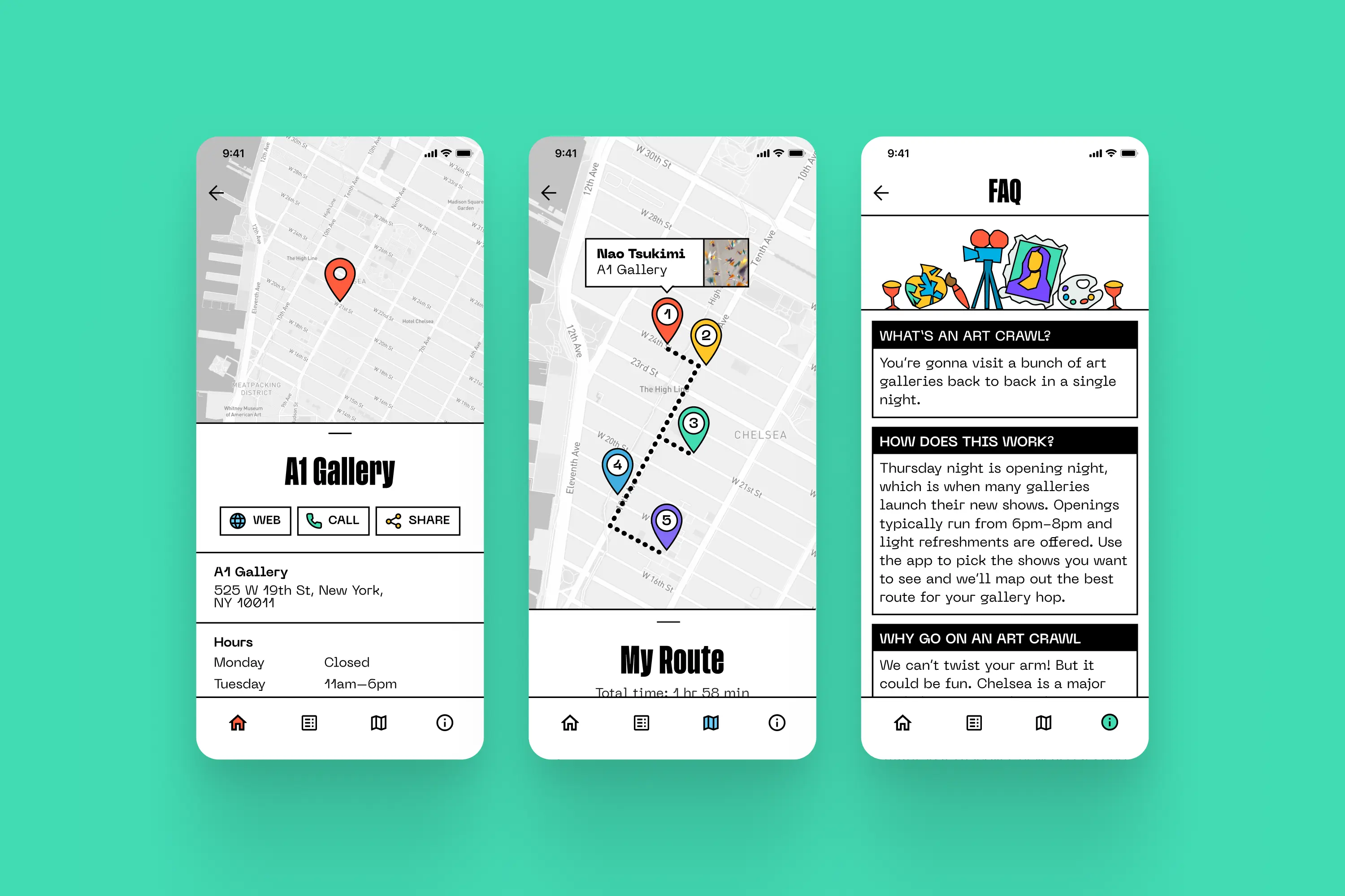 Branding, UI/UX, and motion design for an app to help users go on art crawls in New York City.