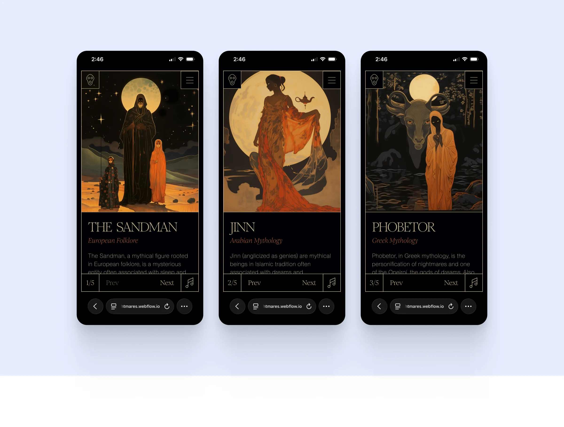 Before AI art, producing a cohesive body of high-quality illustrations was both expensive and time-consuming. That tension made me curious, how far could these tools go in empowering design, storytelling, and digital experiences? This website was designed and built to explore that question, while also serving as a creative playground for motion and interaction on the web. All imagery on the site was generated using Midjourney, with Photoshop supporting final color alignment. Conceptually, the mythology of nightmares serves as a personal interest and provided a rich sandbox for the research, imagery, and narrative of the site.